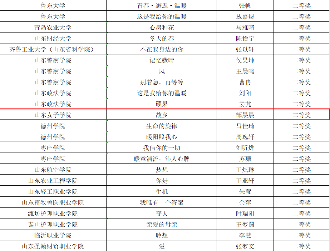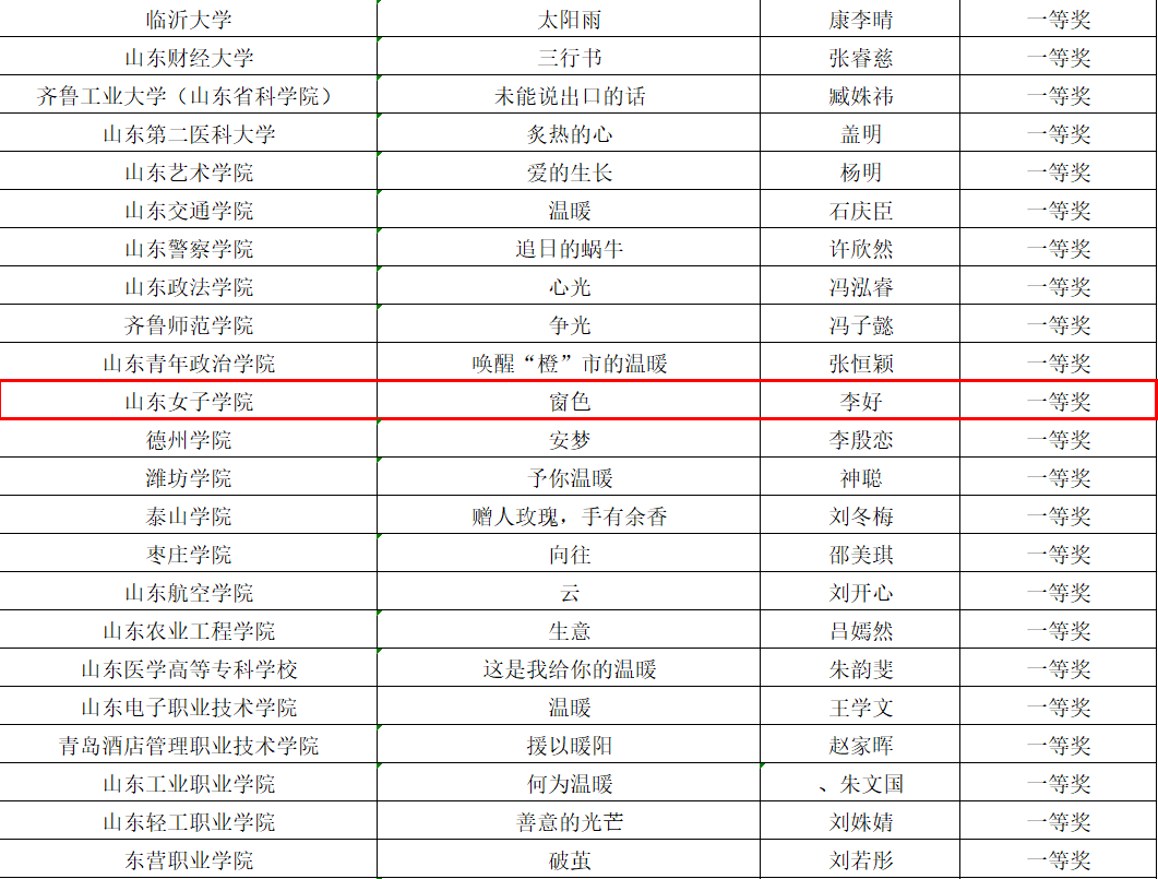 经学校推荐、专家评审、网上公示等环节,我校学生作品《窗色》获得一等奖;学生作品《故乡》获得二等奖;师生合作作品《情绪漂流瓶》获得三等奖;老师合作作品《花语润心,助力生命绽放--山东女子学院举办“花心润色”特色活动》获得三等奖。