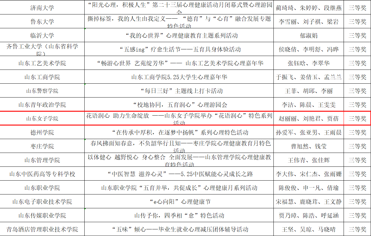 近日,山东省高等学校思想政治教育研究会大学生心理健康教育专业委员会公布了2024年山东省高校心理健康教育月展示活动评选结果,我校师生共计4项作品获奖,包括心理健康教育特色活动1项,心理健康教育中心IP形象设计1项,“这是我给你的温暖”三行诗2项。