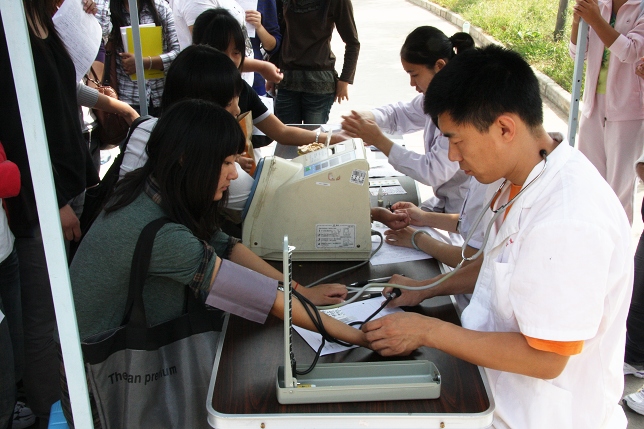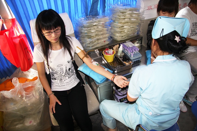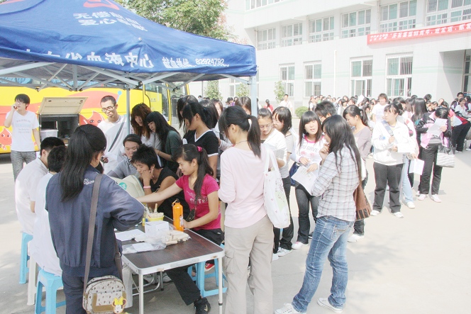 9月25日上午,我院举行了“庆祝建国60周年,迎全运、献爱心”大学生无偿献血活动,该活动得到了全院学生的积极响应,在食堂南门前,长长的队伍蜿蜒数十米,同学们自发的排起队来无偿献血,为祖国60华诞奉献自己的爱心。志愿者同学积极忙碌着,组织填写个人信息,随时提醒大家献血的体质标准和注意事项。献血学生纷纷表示了对此次活动的支持,“我用献血来表达对祖国60岁生日的深情厚意,心里特别高兴。”“全运会在我们家门口召开,我们大学生可以为全运做点贡献。”“感谢学院给了我们这次机会,让我们身体力行,表达自己的小小心意。”排在献血队伍中的同学们随时交流着,血液中心工作人员也对我院同学的热情表示赞叹和感动。