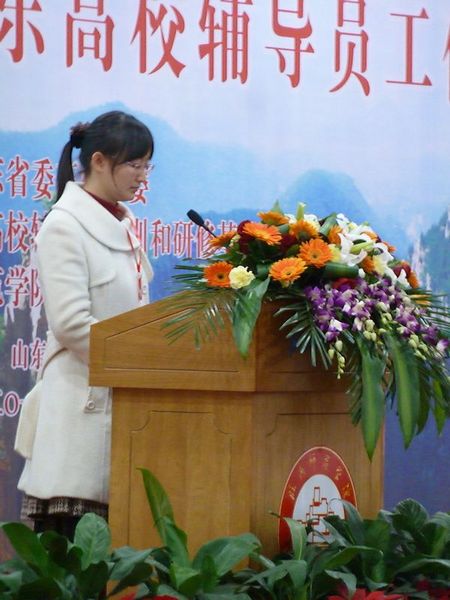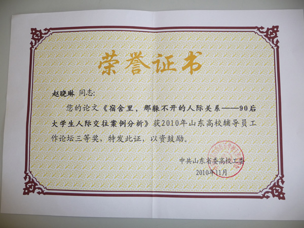 11月11日——12日,2010年山东高校辅导员工作论坛在临沂师范学院召开,我校学生工作处董玉新副处长、文化艺术学院辅导员赵晓琳参加了此次论坛。我校报送的赵晓琳老师的论文《宿舍里,那躲不开的人际关系——90后大学生人际交往案例分析》荣获三等奖,赵老师作为主论坛十位发言人之一在大会上做了发言。