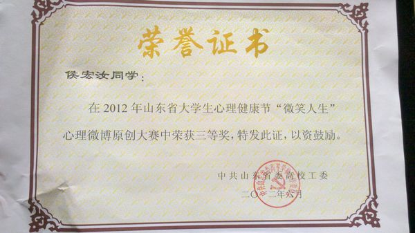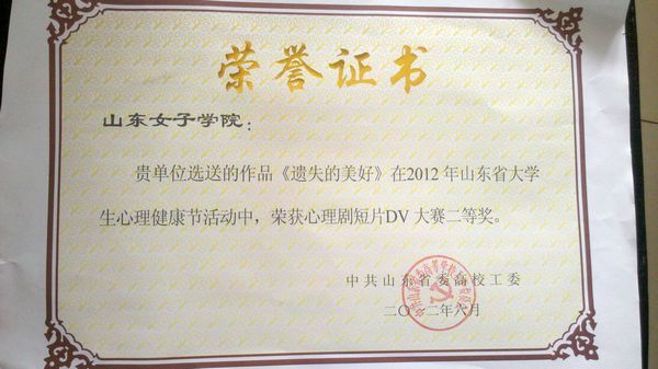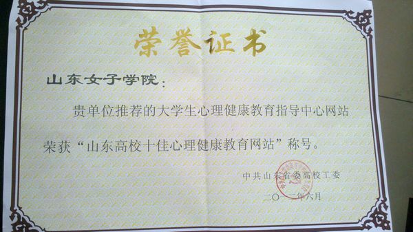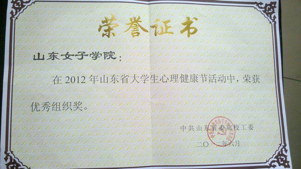 在本次心理健康节中,我校荣获山东省大学生心理健康节优秀组织单位奖,我校大学生心理健康教育指导中心网站荣获山东高校十佳心理健康教育网站,旅游学院《遗失的美好》获山东高校心理剧二等奖,旅游学院侯宏汝同学的微博获山东高校“微笑人生”大学生心理微博原创大赛三等奖,教育学院李晓雨同学的作品《月皓》获“阳光笑脸”采集活动优秀作品奖。