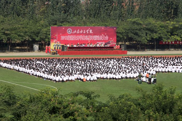 9月14日上午,阳光明媚,秋风送爽,我校2012级新生开学典礼暨军训动员大会在田径场隆重举行。学校领导孙秀丽、范素华、宿建沛、宋兆静、汪琦、贺兴利和中国人民解放军71939部队教导员王军出席了大会,全体教官、各部门、各单位负责人、2012级全体新生参加了大会。大会由宋兆静副院长主持。