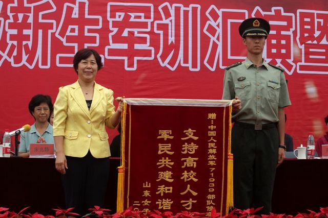 大会在庄严的国歌声中拉开帷幕,伴随着雄壮的《中国人民解放军检阅进行曲》,范素华院长在阅兵总指挥的陪同下检阅了各连队。在分列式中,受训新生以昂扬的斗志、饱满的激情,迈着整齐、坚定的步伐走过主席台,接受领导们的检阅,充分展现了我校大学生蓬勃向上的精神风貌。分列式结束后,新生连队进行了日常养成动作、军体拳、手语操《感恩的心》表演,赢得了阵阵掌声。党委书记孙秀丽向中国人民解放军71939部队首长赠送锦旗。纪委书记汪琦宣读了《山东女子学院关于表彰2012年军训先进集体和个人的决定》,对获奖的10个先进连队、8名优秀教官、72个优秀宿舍和72名先进个人进行了表彰。艺术学院2012级艺术设计本科2班王艺霖同学代表全体新生发言。