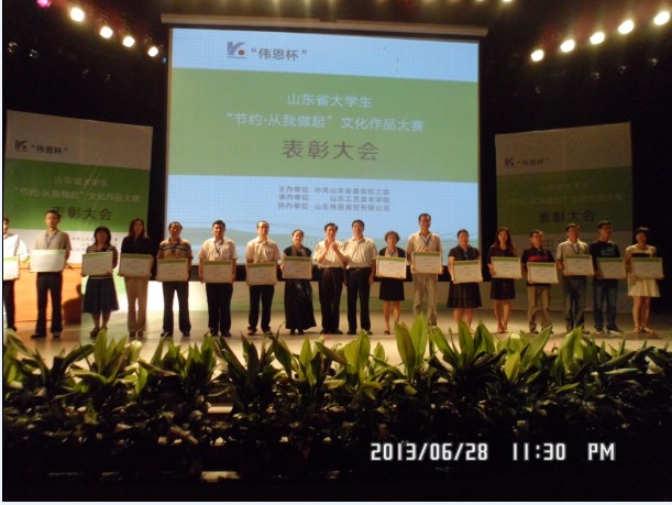6月28日,山东省大学生“节约,从我做起”文化作品大赛表彰大会暨优秀成果展在山东工艺美术学院召开,我校党委副书记宿建沛应邀参加了表彰大会。在此大赛中,我校荣获优秀组织单位称号,艺术学院毕凌竹同学的《耀》荣获艺术设计类二等奖,邢少晨、李春燕、李维三位同学获艺术设计类优秀奖。
