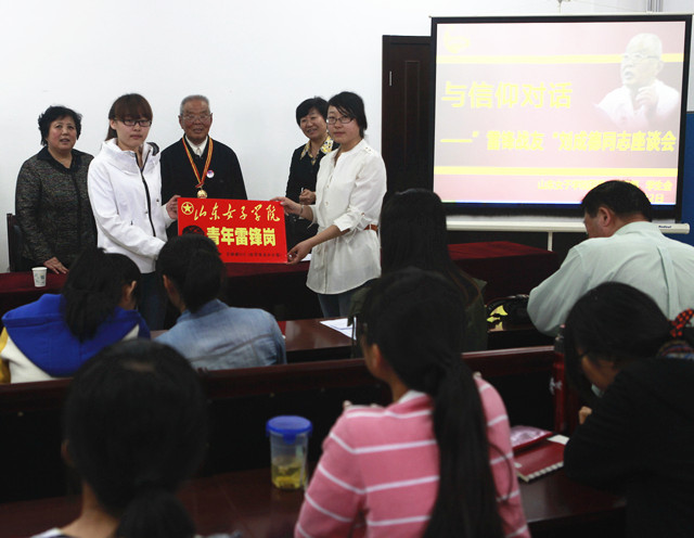 刘成德为我校“青年雷锋岗”授牌并与学生座谈。座谈会上,宿建沛为刘成德颁发了捐赠证书,并对刘成德的捐款善举表示衷心的感谢,对他长期以来对我校大学生思想政治教育工作的支持表示感谢。