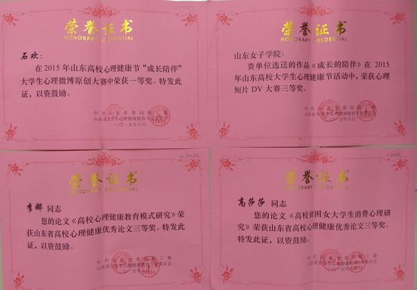 会上对2015年山东省大学生心理健康节中的先进集体和个人进行了表彰。我校上报的参赛作品从全省122所高校的967副作品中脱颖而出,经济管理学院2014级人力资源与管理本科班石欢同学的微博获微博原创大赛一等奖、信息技术学院选送的心理情景剧《成长的陪伴》获山东省心理剧短片DV大赛三等奖、教育学院李娜老师、会计学院高莎莎老师论文分别获心理健康优秀论文三等奖。