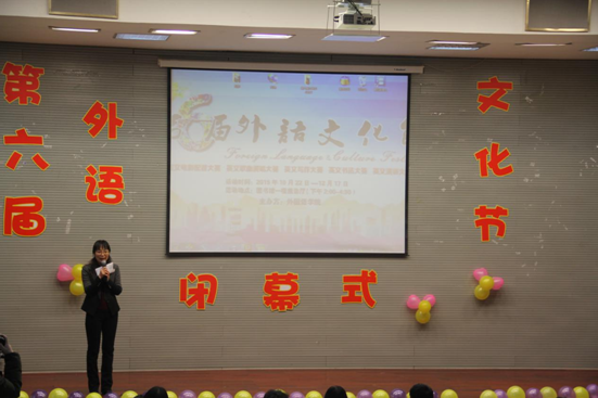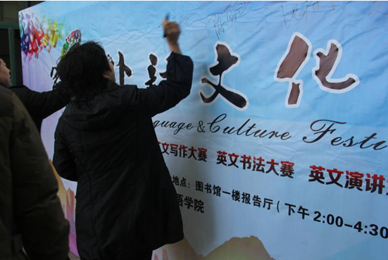 2015年12月17日下午两点,在学校各部门的大力支持下,由外国语学院主办,大外部承办的第六届外语文化节闭幕式在图书馆一楼报告厅隆重举行!学校领导王淑霞副院长出席闭幕式并致辞。外国语学院领导、大外部的全体教师,各个学院的学生代表参加了本次活动。出席的领导、嘉宾、观众入场前在场外的幕布上签名留影。