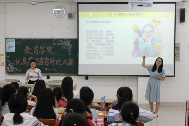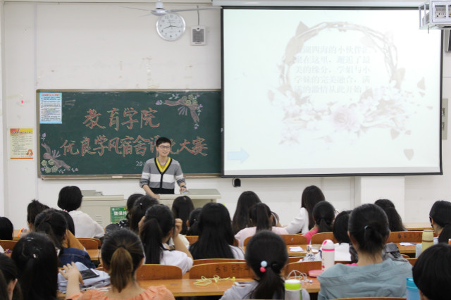 2016年5月17日晚,教育学院于博文楼208教室举办了优良学风宿舍评比大赛。担任本次比赛的评委有教育学院学生会五名部长以及由各班代表组成的大众评审团,教育学院部分学生观看了本次比赛。