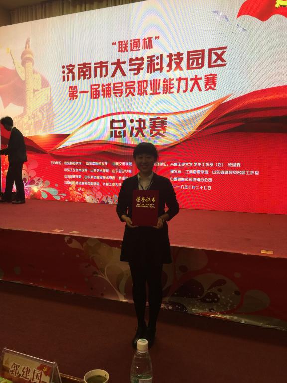 10月27日,“联通杯”济南市大学科技园区首届辅导员职业能力大赛在齐鲁工业大学隆重举行。中共山东省委高校工委副厅级巡视员刘欣堂、教育部辅导员培训和研修基地(山东大学)办公室主任夏晓虹、山东省高校德育研究中心主任姚昌等领导专家莅临大赛决赛现场并担任评委。我校文化传播学院辅导员杨晓斐荣获大赛三等奖。