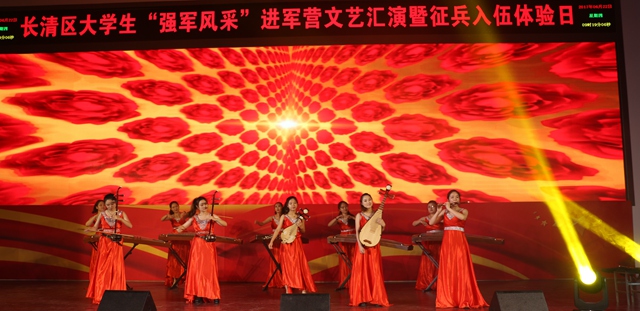 6月23日上午,由长清区武装部和驻长清某部队联合举办的以“强军路上斗志扬•无悔青春献国防”为主题的进军营文艺汇演暨征兵入伍体验日活动在驻长清某部队举行。参加本次活动的有部队领导、各高校代表以及官兵战士和学生代表。本次文艺汇演共有6所高校和某部队选送的13个节目,其中包括我校选送的《唱支山歌给党听》、《八女投江》、《千丝万缕一片情》三个节目。