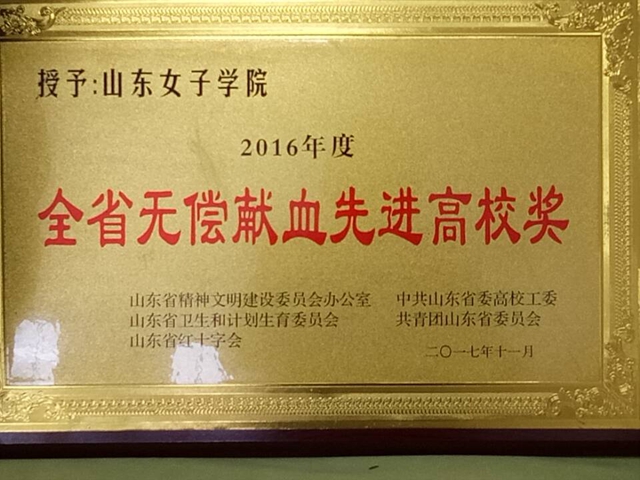12月7日,由省文明办、省委高校工委、省卫生计生委、团省委、省红十字会主办,省献血办公室、省血液中心承办的2016年度驻济高校无偿献血表彰会在山东大厦举行。会上对在2016年度全省高校无偿献血工作中贡献突出的集体和个人进行了表彰。我校荣获“2016年度全省无偿献血先进高校”荣誉称号,2位老师荣获“2016年度全省高校无偿献血工作先进个人”荣誉称号,7名同学被评为“2016年度全省无偿献血爱心大学生”,校大学生自律委员会荣获“2016年度全省高校无偿献血志愿服务先进集体”荣誉称号,1名同学被评为“2016年度全省高校无偿献血志愿服务先进个人”。