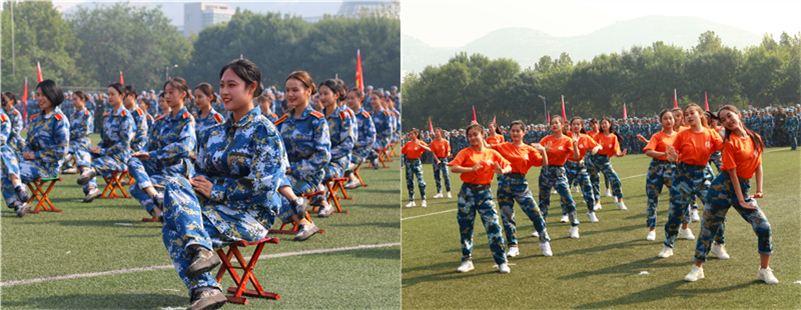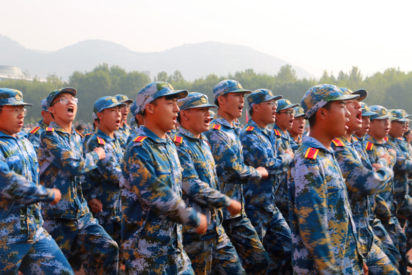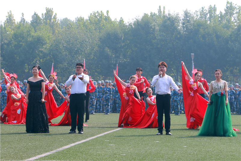 刃出鞘、英勇威武的匕首操,还有展现女院大学生优雅端庄之仪态、文明修身之作为的礼仪操、健美操表演,更有向祖国70周岁生日献礼的旗语操和爱国歌曲合唱。两百余名同学组成的旗语操表演方队,挥动红黄两色旗帜,用海军旗语打出了“坤德含弘 至善尚美”的校训,“军民鱼水一家亲”、“我爱你中国”等美好祝福。《为祖国干杯》、《强军战歌》等合唱节目,唱出了强军梦、强国梦的伟大中国梦。