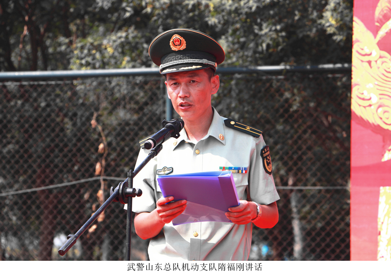 党委书记郭翠芬代表学校向承训部队武警山东总队机动支队赠送锦旗,赞誉“武警卫士 尖刀铁拳守卫齐鲁大地,同心向党 军民融合共铸复兴伟业”。