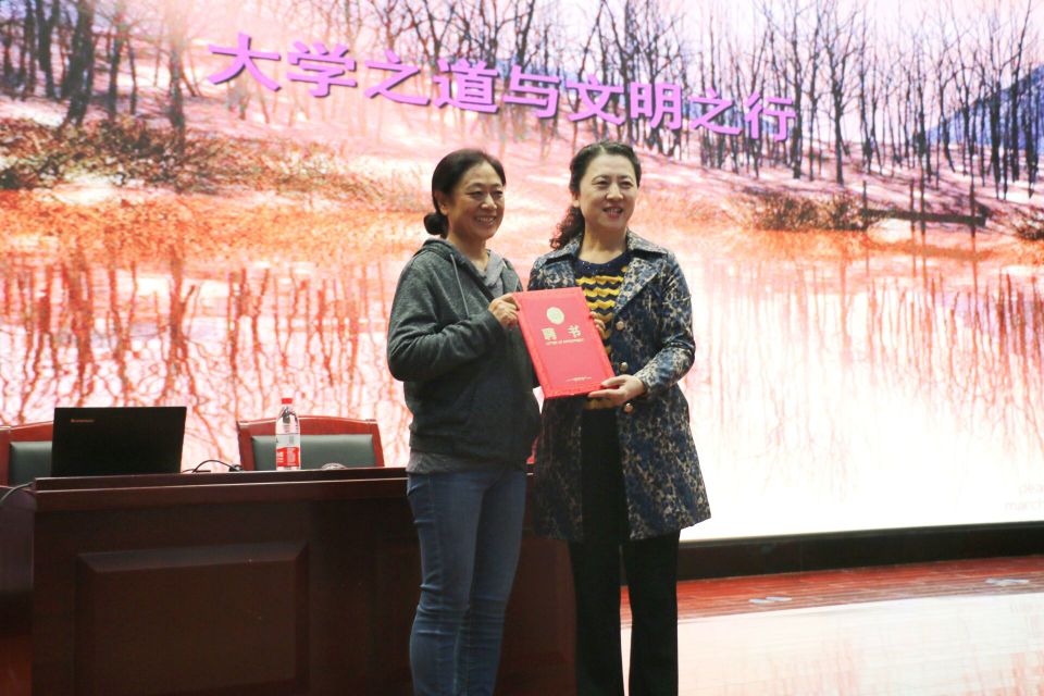 田教授的报告具有国际视野,开拓了学生的眼界,学生处负责人为其颁发了聘书,聘请其为山东女子学院文明素养讲师团专家成员。