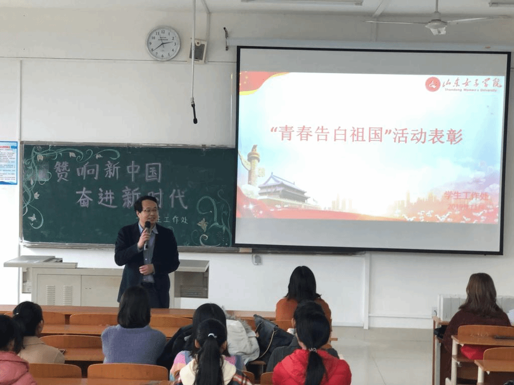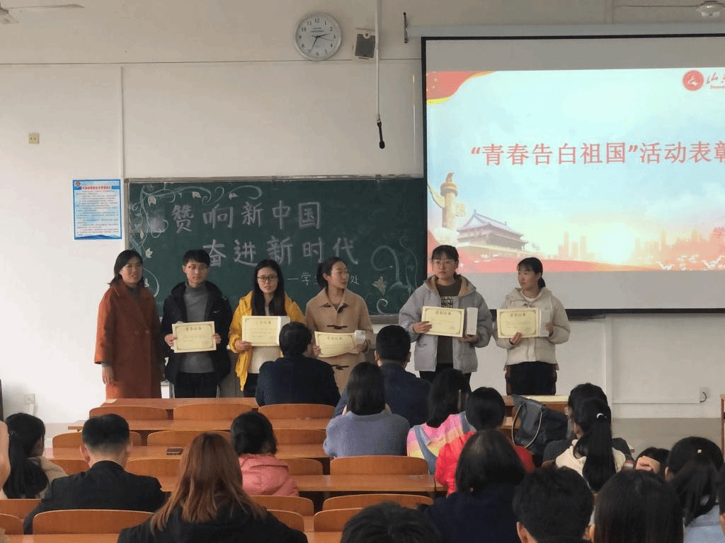 赞响新时代,奋进新时代。11月21日下午在博文楼举行了“青春告白祖国”的活动以及2019级入学测试表彰仪式,学生工作处王永泉处长,尹衍梅副处长参加表彰活动。对前期通过易班开展的入校教育测试获得满分的26名同学和“青春告别祖国”获奖的46组同学进行表彰。