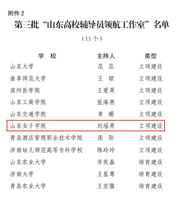 近日,中共山东省委教育工委、山东省教育厅发文公布了第三批“山东高校辅导员领航工作室”名单,我校以工商管理学院党总支副书记刘瑶青为主持人的辅导员工作室成功入选。