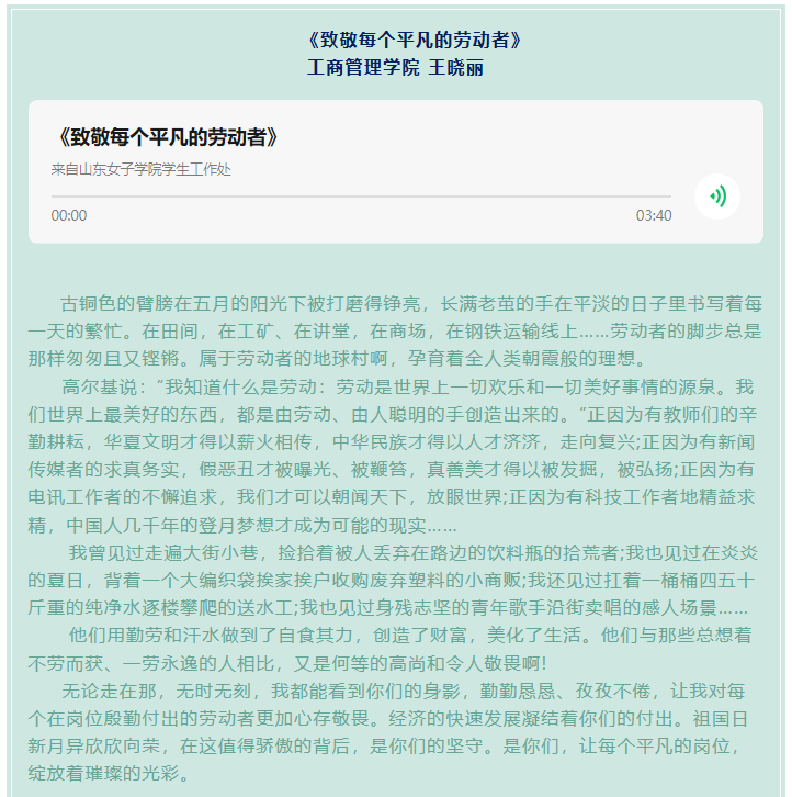 为教育引导学生树立正确的劳动观,崇尚劳动、尊重劳动,向新时代劳动者致敬。学校易班工作站于“五一”劳动节期间,面向全体在校生,组织开展了“致敬劳动者 争做新时代青年”线上活动。