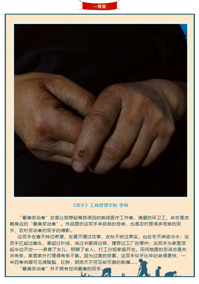 本次活动依托易班线上平台进行,分为“最美劳动者”图片作品征集与“致敬劳动者”音频作品征集两种形式。共收到各类参赛作品近1000份,参与学生来自12个学院4个年级,经各二级学院易班分站推优、学校易班工作站初选、学生处评审等环节,评选出79份获奖作品。活动使劳动最光荣、劳动最崇高、劳动最伟大、劳动最美丽的价值观深入女院学子心中,为养成热爱劳动尊重劳动的优良习惯打下坚实基础,引导每一名学生成为勤于劳动、善于劳动的新时代青年。