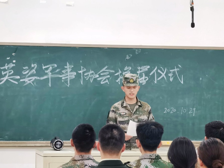 大会在全体人员高唱国歌拉开序幕。首先,主持人宣布本次换届人员名单。英姿军事协会指导老师讲话,她对这一年英姿军事协成员们的辛勤工作给予了充分肯定,对英姿协会的工作成就表示认可,希望新一届会员用积极的心态去投入到今后的工作和生活。新任会长周涛发表了就职演讲,他首先带我们回顾了英姿军事协会过去一年来开展的工作和取得的成绩,并阐述了以后的工作规划和要求,希望英姿军事协会能够继续发扬和延续优良作风,做好征兵宣传、国防教育等工作。新生代表郑超群同学代表全体英姿军事协会成员发言,她表达了对英姿军事协会的憧憬和热爱,并表示将遵守社团章程,积极参加社团的各项活动,提升综合素质,为国防事业贡献自己的力量。