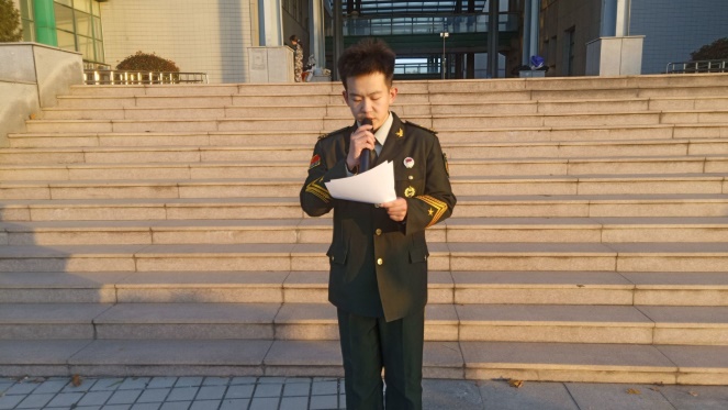 默哀结束后,由学生代表朗诵《我爱你,我的祖国》。一句句赞美的诗歌,一声声亲切的呼唤,“我爱你,我的祖国!”,这一句发自内心的话,响彻了整个广场,也深深刻在每一位中华儿女的心中!学生代表的发言,慷慨激昂,呼唤着每一位中华儿女以拳拳爱国之心报效中华,懂得感恩,缅怀先烈。以己之真才实学报效祖国,对得起先烈付出的鲜血,使这盛世,真正如先人所愿!接下来,由英姿军事协会副会长刘富强发表了题为《勿忘国耻,振兴中华》的演讲,我们要珍惜来之不易的胜利与和平,铭记历史,发奋图强,积聚力量,为实现“两个一百年”奋斗目标和中华民族伟大复兴的中国梦而努力奋斗。