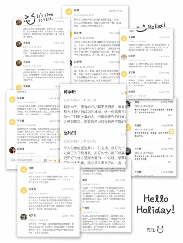 线上活动历时7天,同学们参与了《大学之道》、《目标管理与时间管理》、《感恩励行与责任担当》等专题的学习和互动。济南电视台《我的正能量》专题主讲嘉宾郑奕老师和国家认证职业核心能力培训师侯华玲老师线上授课并进行远程指导;教师建立班级学习群,进行在线指导和答疑,有效提升在线学习的趣味性和互动性;同学们积极参与,课程通过率达到100%。