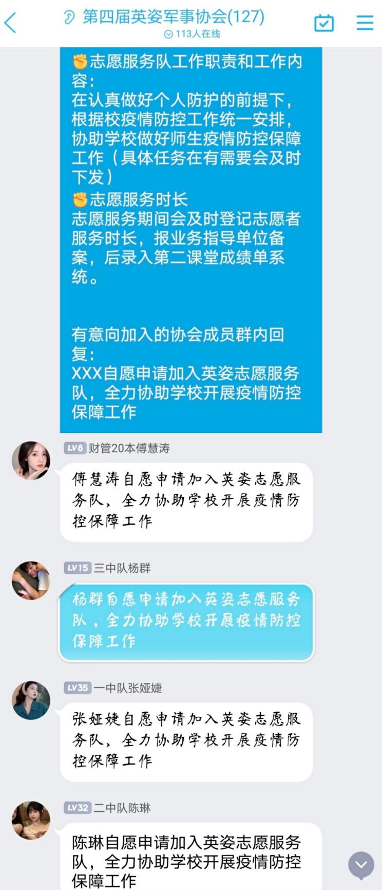 通知下发后,英姿成员积极踊跃报名要求加入志愿服务队,志愿为疫情防控贡献自己的一份力量!