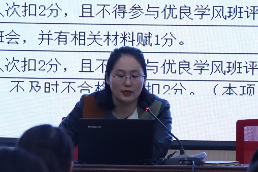 学生工作处分管处长赵丽丽详细解读了《山东女子学院班风建设实施方案》。她指出,班风是学生成长的基础和前提,班风建设是校风建设的重要内容。要通过“七个一”建设抓好班风建设:制定一套班风建设评价指标体系、制做一本优良学风班创建手册、开展一系列班级形象设计活动、建设一支过硬学工队伍、打造一个网络班级、以班级为单位通过“五个一”组织一系列丰富多彩的班级集体活动、开展一项班级评价表彰工程。