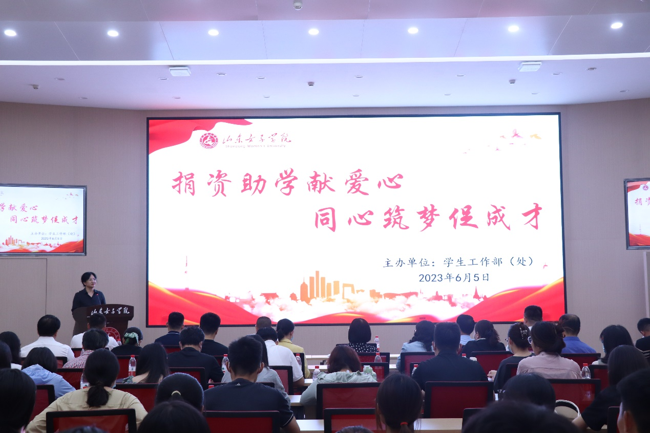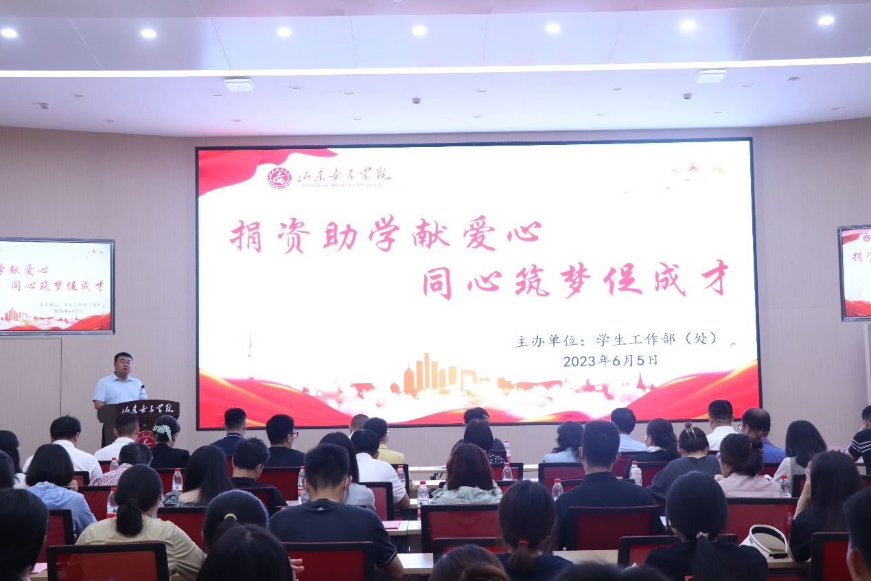 为推动学习贯彻习近平新时代中国特色社会主义思想主题教育走深走实,扎实推进“为学生办实事”工作,6月5日下午,学生工作部(处)在求真楼报告厅举办“捐资助学献爱心同心筑梦促成才”助学活动。学校党委副书记、校长李光红出席,中国移动通信集团山东有限公司济南分公司、山东广伟被服有限公司、济南市长清区高联培训学校有限公司、济南市长清区廿书教育培训学校有限公司相关负责人、各学院学工办主任、学生工作部(处)相关人员、部分师生代表参加本次活动。
