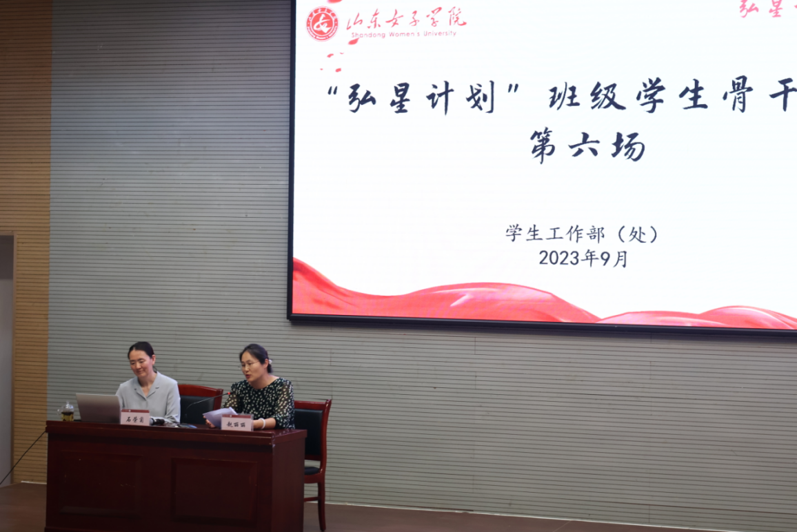 立德树人,思政先行。9月21日下午,学校在图书馆一楼报告厅开展 “弘星计划”班级学生骨干培训班第六场培训。本次培训由学生工作处赵丽丽副处长主持,特邀马克思主义学院副院长石荣菊副教授主讲,各二级学院辅导员代表、2023级班级学生骨干培训班学员以及校自律会易班工作站主席部长共计200余名学生参加培训。