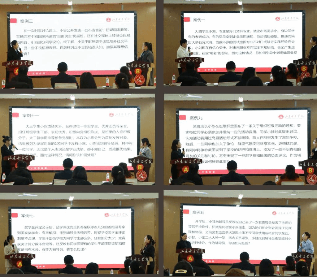 12名参与考核的辅导员两两分组,按照A、B角色“我提问,你回答”案例研讨的方式,共同辨析原因、研讨对策、总结规律。研讨过程中,每一位辅导员都怀揣着对学生深沉的爱与责任,带着饱满的热情和专业的态度,诠释着“立德树人”的深刻内涵。
