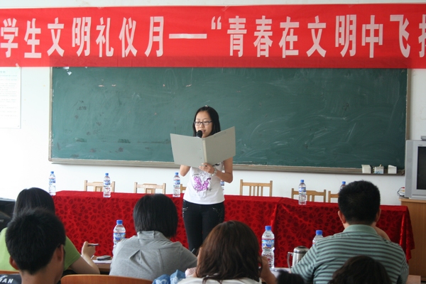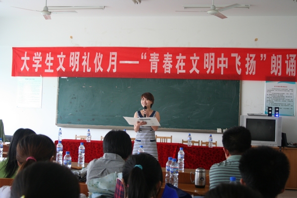2010年6月10日下午,“青春在文明中飞扬”朗诵会在普教楼301隆重举行。本次朗诵会作为大学生文明礼仪活动月系列活动之一,旨在倡导校园文明,丰富大学生课余文化生活,锻炼语言表达能力,提高文明素养。