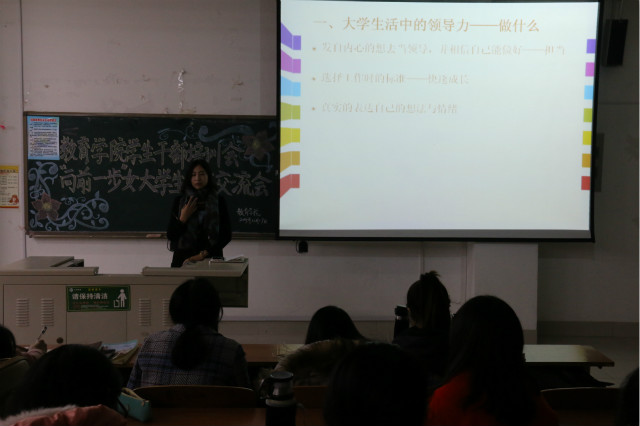 会议伊始,王晓明主席就以提高当代女大学生干部的领导能力为着力点,以播放视频、PPT的形式展示出当代女性在社会发展中的重要地位,并巧妙的结合当今时事热点向大家阐明了女大学生干部提升领导能力的重要性。不仅如此, 她更是通过自己的学习和工作经历详细的表达了自己对于此类问题的看法,认为女大学生的领导力主要表现在有能力胜任自己的角色并实现责任与权力对等方面。同时,她表示作为一名女大学生干部必须要有豁达的心胸和良好心态,学会倾听,与时俱进,始终以饱满的热情投入到忙碌的学习和工作中。会议后期,王晓明主席推荐阅读谢丽尔•桑德伯格所著《向前一步》,呼吁大家全方位的提升自己的能力从而为将来更好的发展而打下坚实的基础。