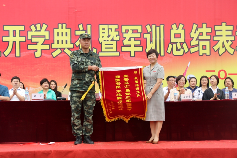 校党委书记郭翠芬代表学校向承训部队武警淄博支队赠送锦旗,赞誉“武警卫士勇冠三军锻造真英才,强国安民军校勠力奋进新时代”,并向承训部队对学校军训工作的大力支持表示感谢。