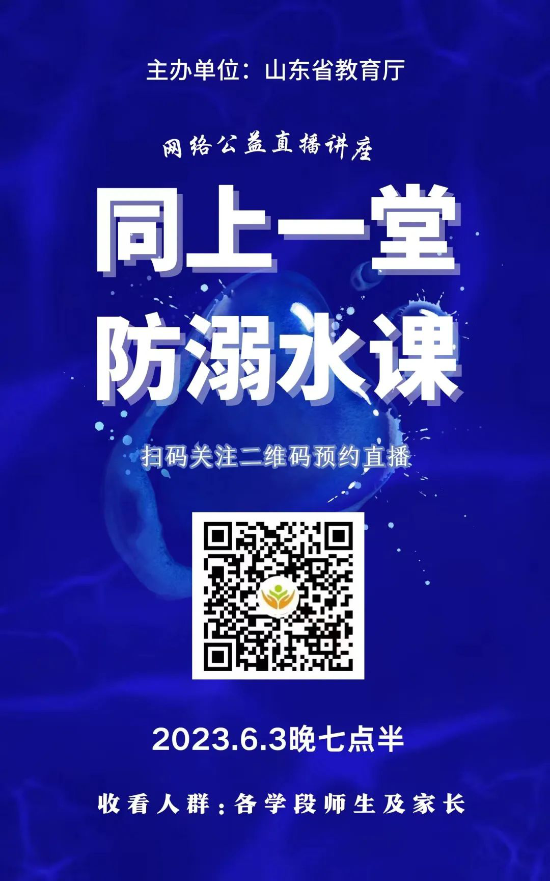 入夏以来,国内连续发生多起未成年学生溺亡事件,令人扼腕痛心。为有效遏制此类事件的发生,结合《2023年“同心防溺水”专项行动工作方案》有关要求,山东省教育厅决定组织开展师生及家长“同上一堂防溺水课”系列网络公益直播讲座活动。