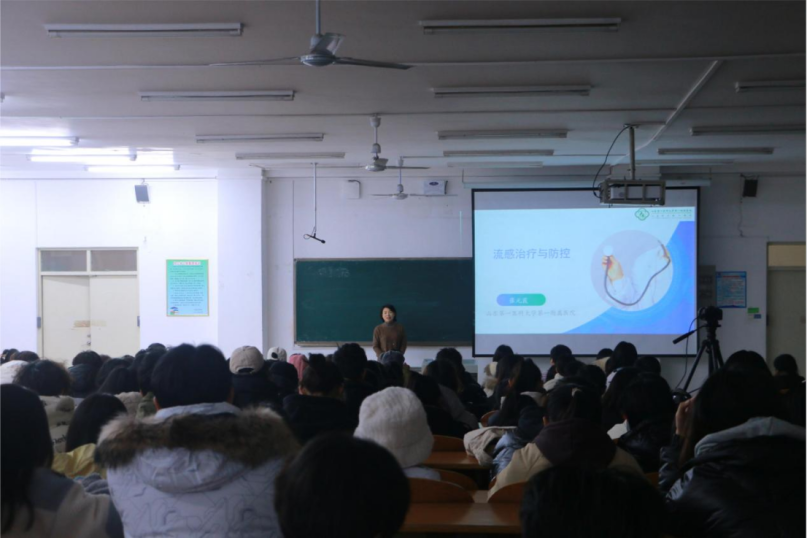 张元霞医师以《流感治疗与防控》为主题进行讲解,她从中国流感流行情况概要、病原学与流行性病学、临床表现与诊断、流感的治疗方法、流感预防和校园日常防控措施这几个方面展开详细的讲解。强调要勤洗手、掩口鼻、少聚集、常通风,均衡饮食、适当的运动、充足的睡眠。