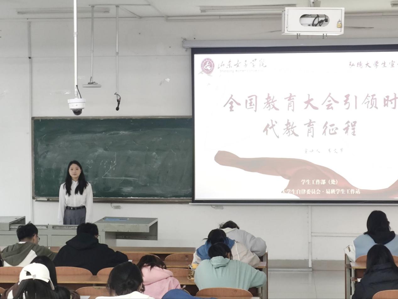 11月4日,校弘德宣讲团成员李文景在博文楼102,开展了一场以“全国教育大会精神引领新时代教育征程”为主题的宣讲活动,众多学生参与,共同深入学习全国教育大会精神。