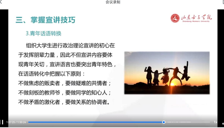 2月3日,由马克思主义学院焦路尧老师围绕“如何做好青年思想政治理论宣讲”进行了经验分享和理论培训。本次培训明确了宣讲工作的重点:凝练宣讲要旨、优化宣讲内容、掌握宣讲技巧。焦老师通过理论指导、方法讲解自身宣讲经验的分享,为宣讲内容的选择、宣讲稿的撰写等都提供了大量的帮助。今后,“弘德大学生宣讲团”将继续开展专业培训,不断增强成员政治本领,开展系列宣讲活动,发挥我校优秀学子的先锋模范作用,增强我校广大学生爱党、爱国、爱校的思想认同和情感认同。