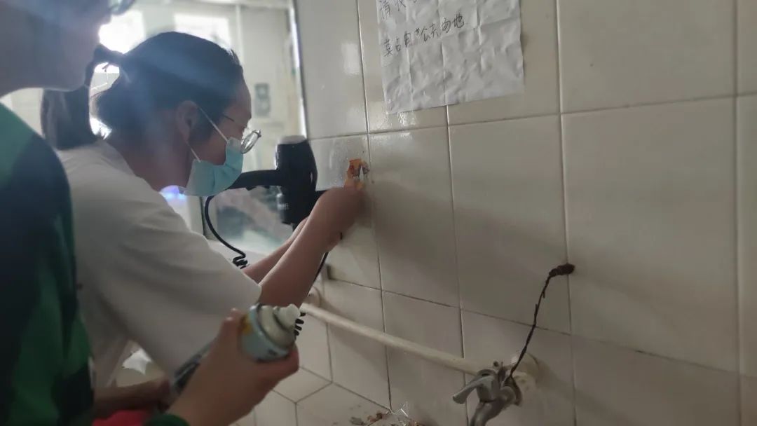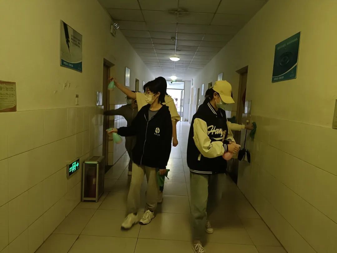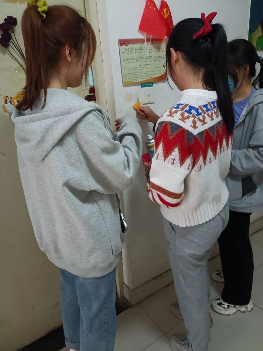 一张小广告张贴仅需3秒钟,清除却要近6分钟,这些“牛皮癣”清理起来十分困难。当日中午,生活部工作人员分发小刀、消毒喷雾、抹布、小铲子等清洁工具,同学们在各宿舍楼楼道和卫生间进行小广告、海报的清理。小广告遍及宿舍楼道的各个角落,粘性大,志愿者们先用喷除胶剂,软化粘胶之后再用小铲子进行进一步的清理,粘满了墙灰纸屑的衣服以及清理后整洁的宿舍楼,让我们看到了他们的努力。随后,志愿者们又在宿舍门口、楼道等公共区域喷洒酒精进行消毒。