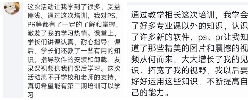 通过本次朋辈辅导培训,参训同学们通过完成课堂任务和参加课后实践训练,学会了图片处理、视频剪辑等专业软件的使用方法,增加了摄影、视频剪辑等方面的知识储备,拍摄剪辑了许多优秀作品,做到了学有所成、学有所获;两位主讲人在讲解专业知识、解答问题的过程中,对所学知识有了更深刻、更系统的理解,达到了教与学相互促进、共同提高的目的。