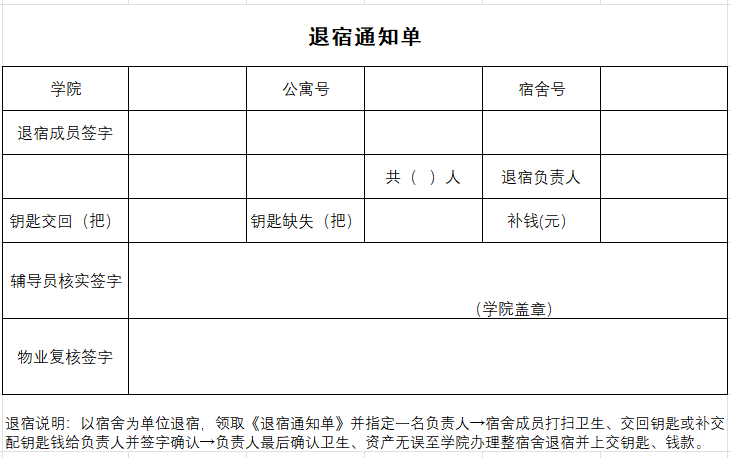 我校2023届毕业生4601人,共涉及714个宿舍退宿工作。为方便毕业生顺利退宿离校,学生工作部(处)公寓管理中心提前4周制定了《山东女子学院2023年毕业生退宿方案》,本年退宿与往年退宿不同,是由毕业生以宿舍为单位向所在学院退宿,学院在检查屋内物品、卫生后,收取《退宿通知单》,为毕业生办理退宿;学院再凭《退宿通知单》向学校退宿。
