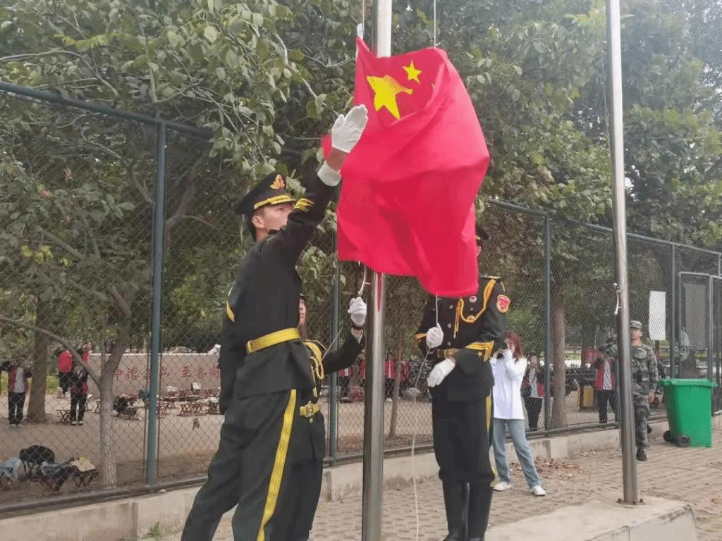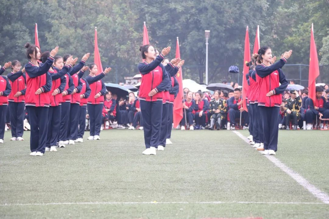 庄严的升国旗仪式拉开了开学典礼的帷幕,伴随着全场高唱国歌,国旗护卫队护送五星红旗冉冉升起。