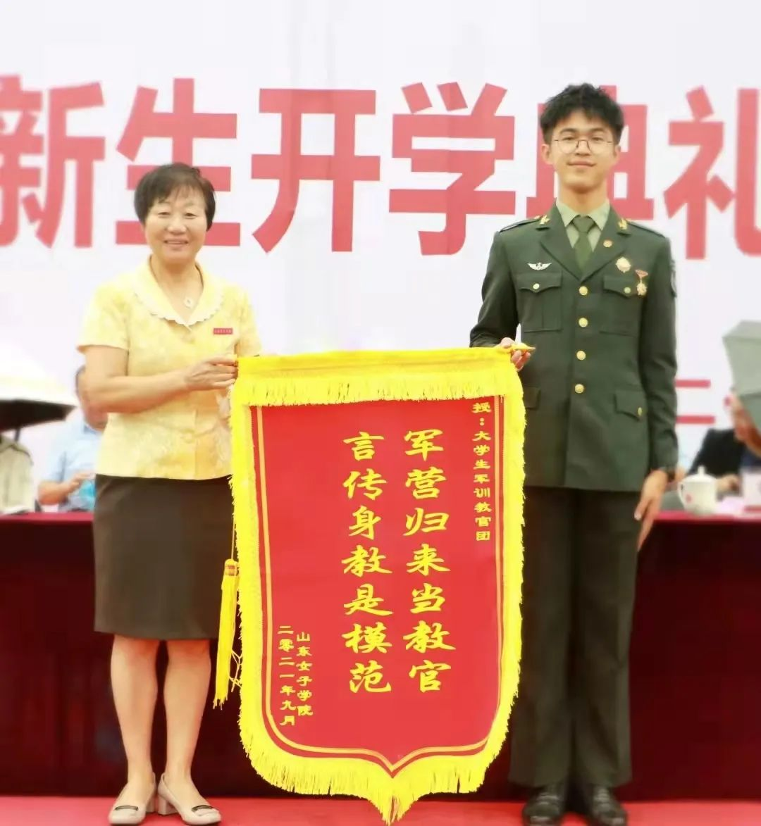 党委书记郭翠芬向大学生军训教官团授锦旗。