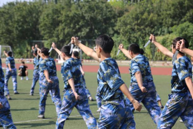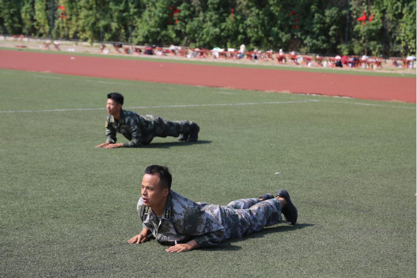 汇报表演进行最后一项:由退伍军人进行实战演练。他们来自不同的兵种,却都用一腔热血为大学生军事浇筑力量。口令响起,退伍军人们立刻上场,两两分组,面对面站立,开始进行格斗演示。他们的动作孔武有力,挥拳干脆果敢,引得新生们阵阵欢呼。面对坚硬的地面,面对炎热的天气,教官们仍不松懈,依然认真地打出一招一式,向大家展示格斗技巧、军人风采。
