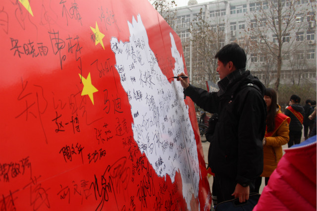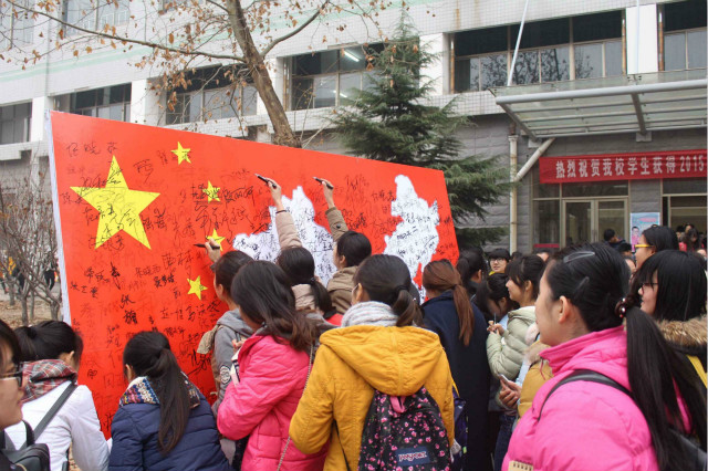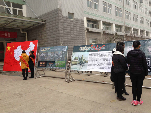 10日上午,教育学院师生于1号教学楼前举办了“众志成城 ‘名’记历史”签名活动、南京大屠杀图片展活动。南京沦陷、一二九运动、珍爱和平等主题图片凸显了日本侵略者的残暴兽性和世界和平正义的力量,全院学生怀着爱国之心踊跃参与签名活动,字字都凝集着对祖国的热爱。当镶嵌着白色中国地图的红色展板被同学们的名字布满,彰显的不仅是共同捍卫祖国领土的爱国情怀,更是中国新一代年轻人齐心协力、奉献祖国的决心。