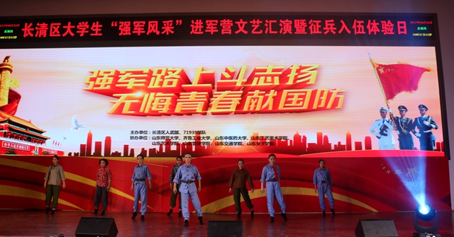 6月23日上午,由长清区武装部和驻长清某部队联合举办的以“强军路上斗志扬•无悔青春献国防”为主题的进军营文艺汇演暨征兵入伍体验日活动在驻长清某部队举行。参加本次活动的有部队领导、各高校代表以及官兵战士和学生代表。本次文艺汇演共有6所高校和某部队选送的13个节目,其中包括我校选送的《唱支山歌给党听》、《八女投江》、《千丝万缕一片情》三个节目。