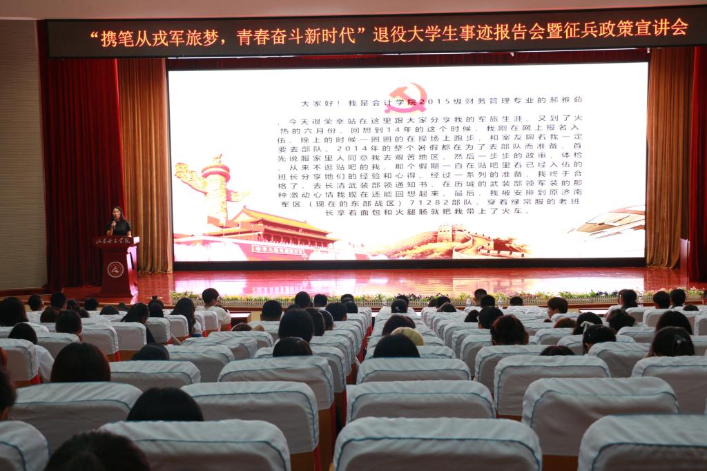为加强大学生的国防教育,加大征兵宣传力度,营造爱国强军的校园文化氛围,6月14日晚上,学校在图书馆二楼报告厅举办了“携笔从戎军旅梦 青春奋斗新时代” 退役复学大学生事迹报告会暨征兵政策宣讲会。学生工作部(处)、人民武装部负责人出席,山东师范大学、山东中医药大学大学生军事协会、齐鲁工业大学教官示范团、山东劳动职业技术学院国旗护卫队等学生社团骨干受邀参加。300余名大学生聆听了报告。