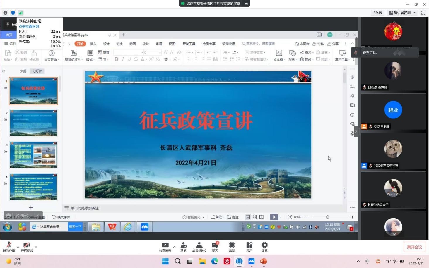 国无防不立,民无军不安,为帮助有志应征入伍的同学了解大学生征兵入伍优待政策,激发同学们应征入伍的热情,2022年4月21日,山东女子学院学生工作部(处)邀请长清区人武部军事科科长齐磊在线上举行征兵宣传讲座,本次讲座由学生工作部(处)负责人主持, 200余名毕业生参加。