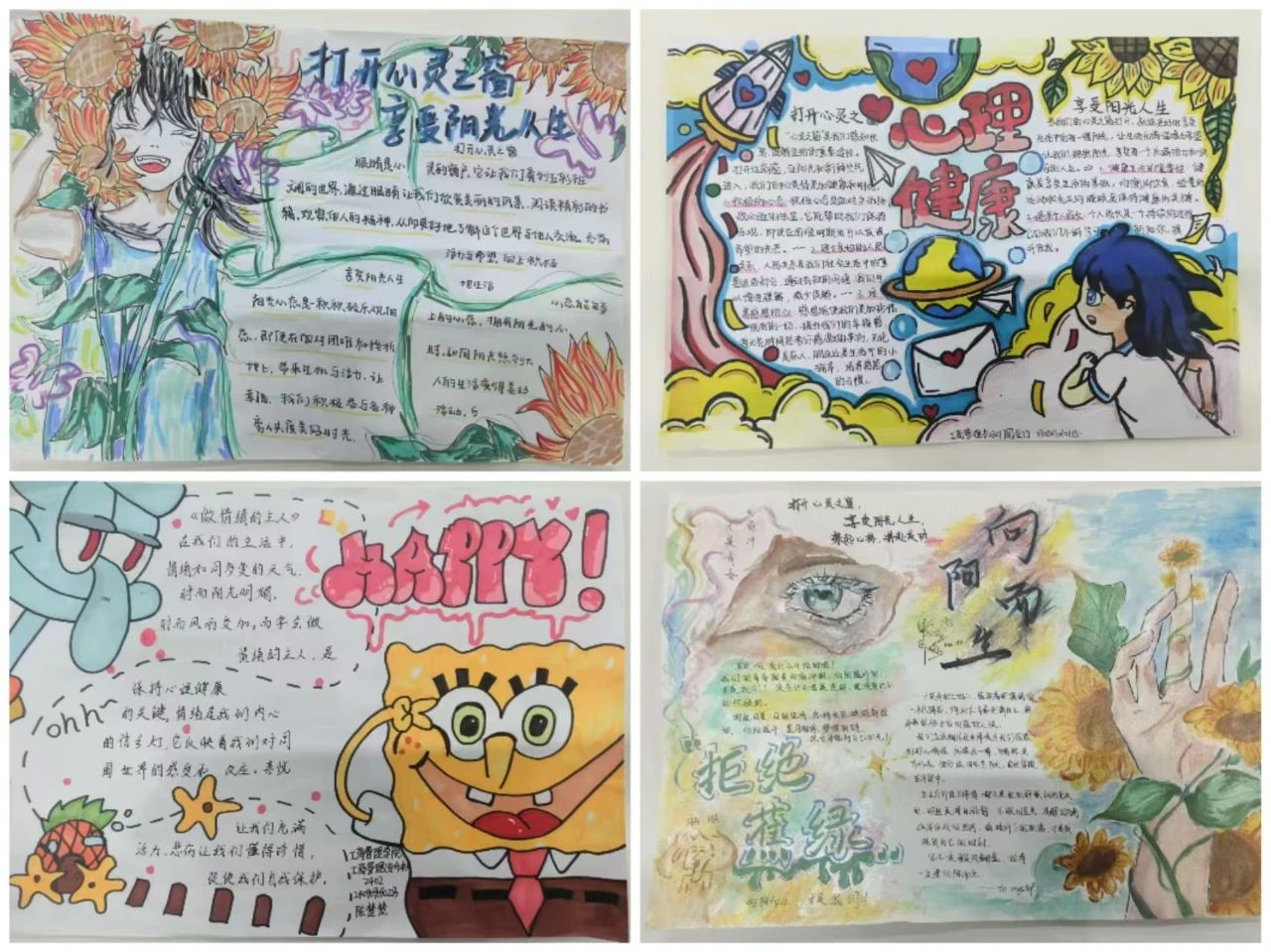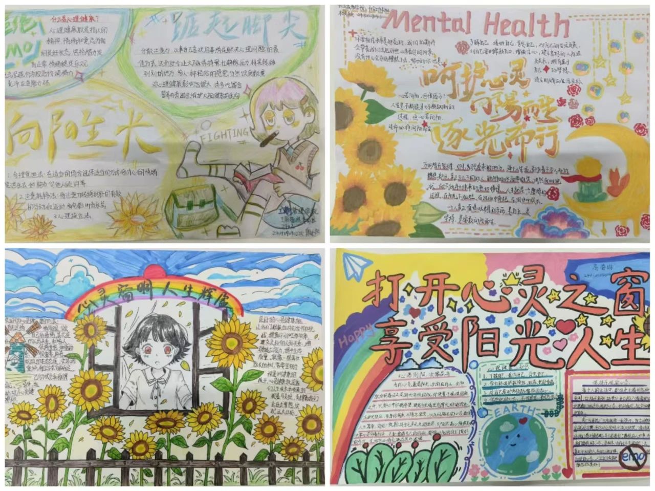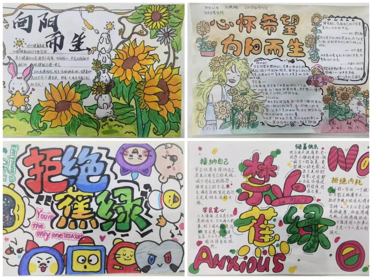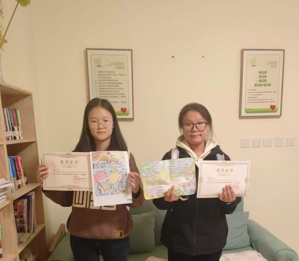 有的作品以温馨的画面展现了关爱他人、积极向上的心态;有的则通过简洁的文字和生动的插图,提醒大家关注自身情绪变化,学会正确应对压力,每一幅作品都凝聚着同学们的心血和创意。