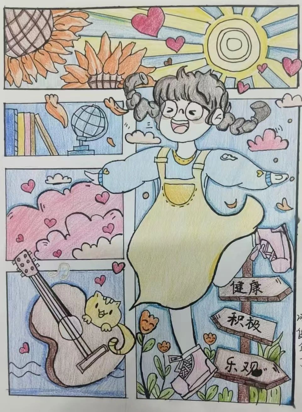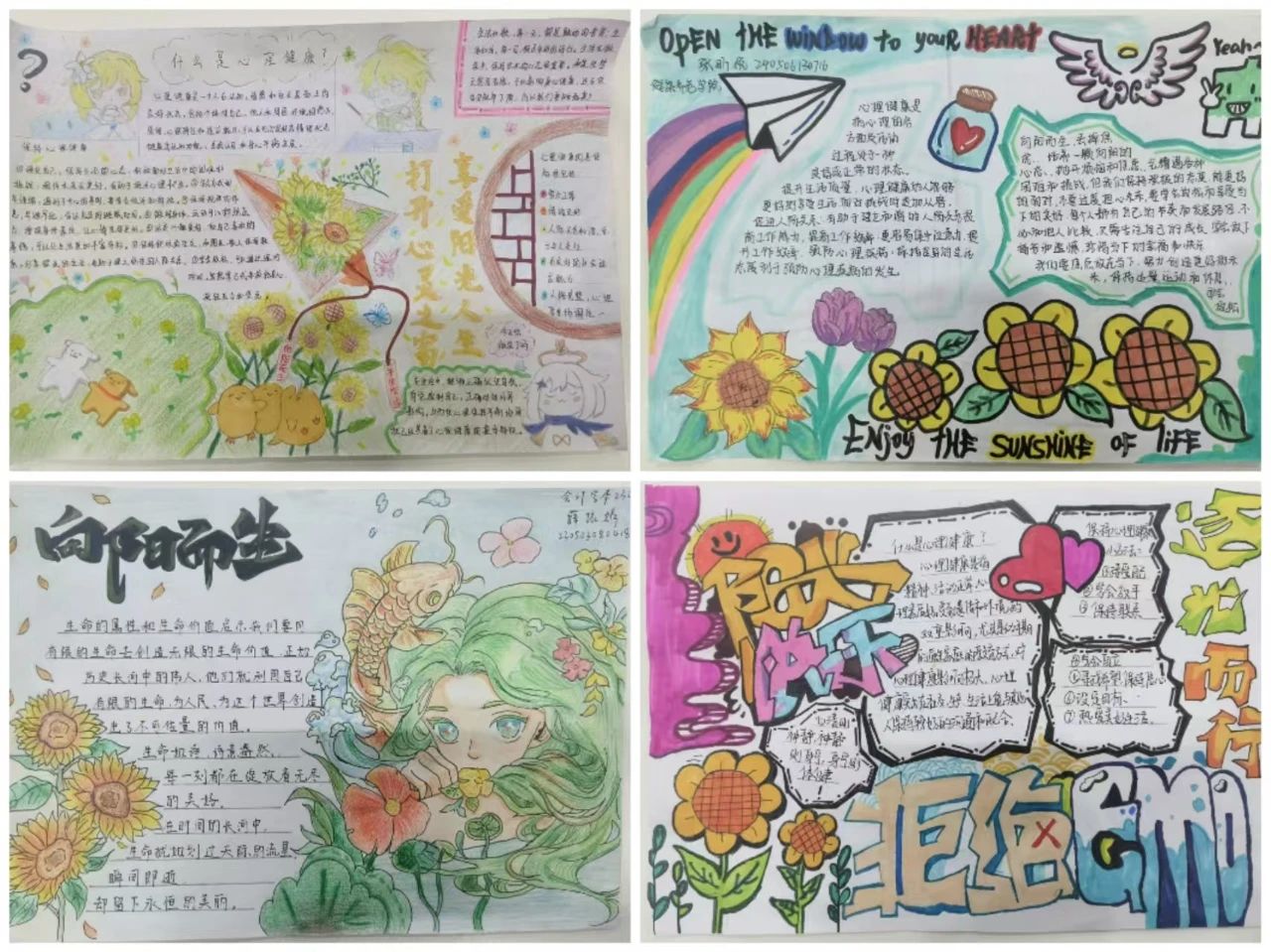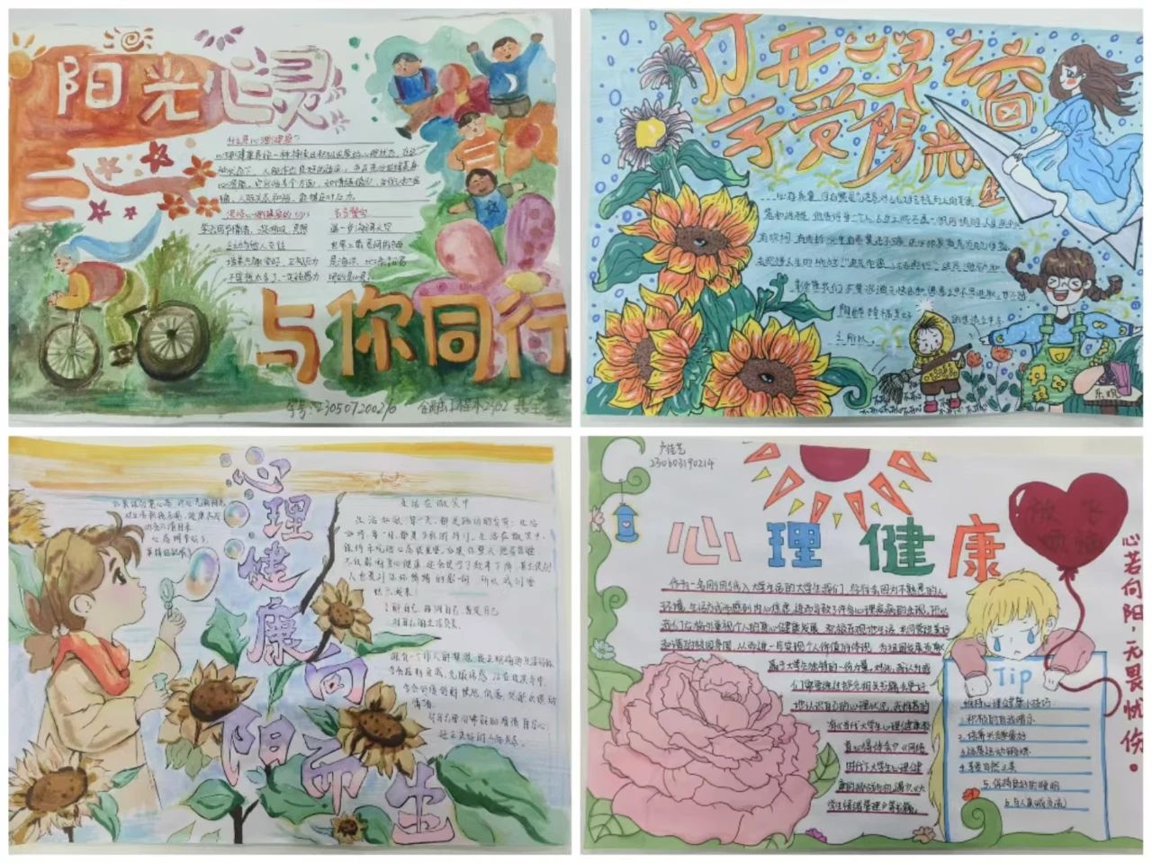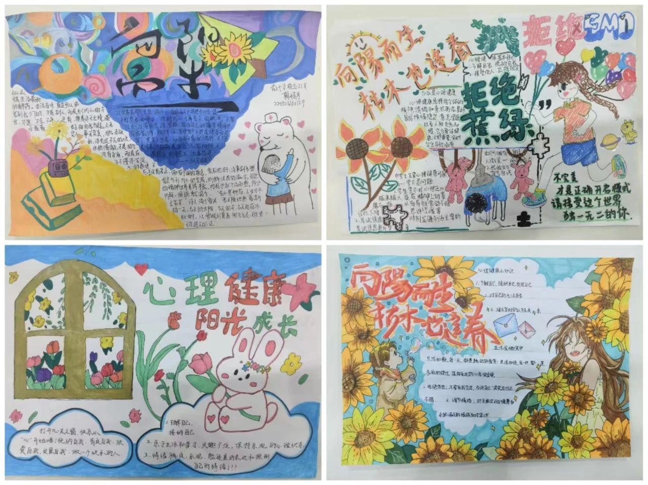 有的作品以温馨的画面展现了关爱他人、积极向上的心态;有的则通过简洁的文字和生动的插图,提醒大家关注自身情绪变化,学会正确应对压力,每一幅作品都凝聚着同学们的心血和创意。