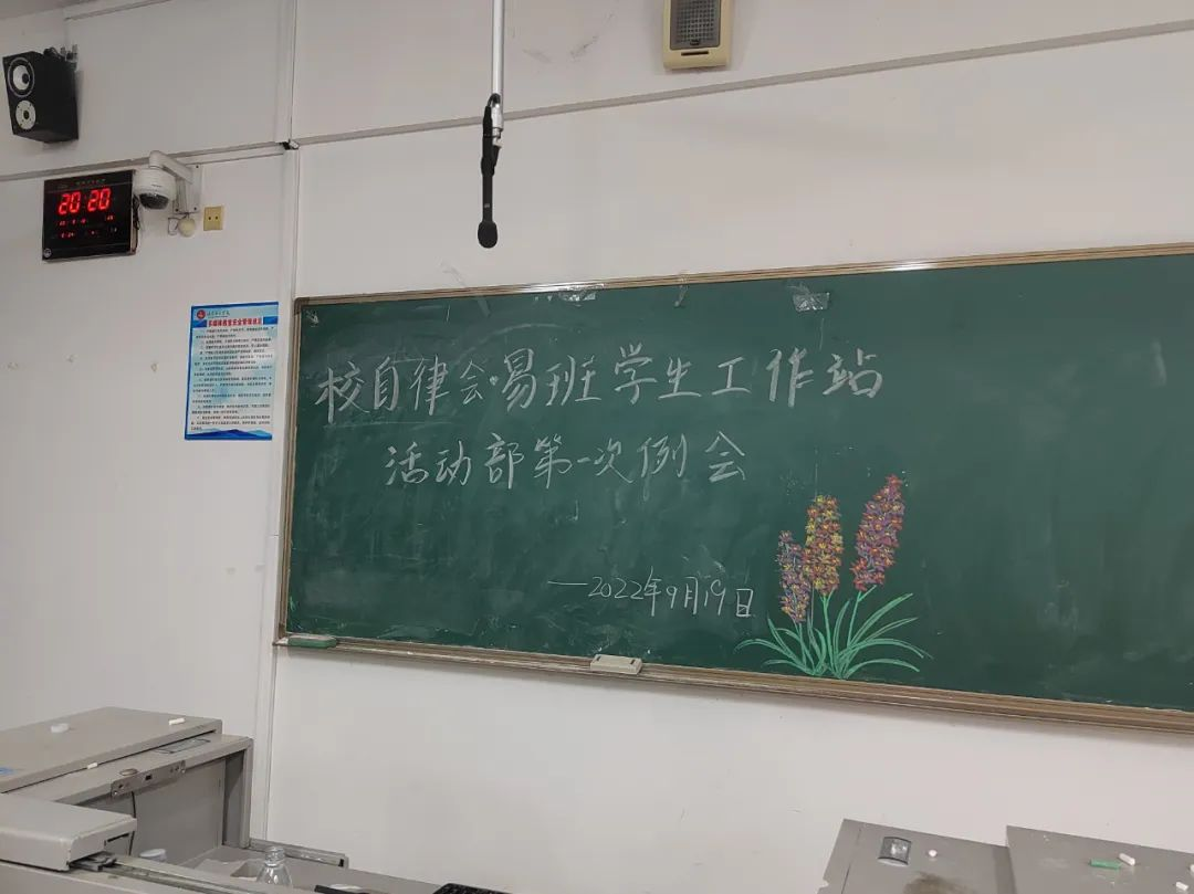 部长和主席进行自我介绍。让部员们进行自我介绍。简单地说一下,我们部门负责的工作。我们部门是积分制的,希望大家积极参加活动。强调一下部门纪律,开会要带本子,无故不请假,不迟到。一些值班的注意事项。提出对大家的期许和希望,希望大家在接下来的一年里积极认真地工作,不辜负自己。给大家布置了一个小任务,完成秋分海报的制作。